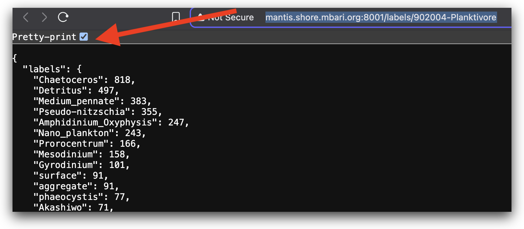 You can get that here for this project: http://mantis.shore.mbari.org:8001/labels/902004-Planktivore this will return all labels in sorted order from the largest to smallest.