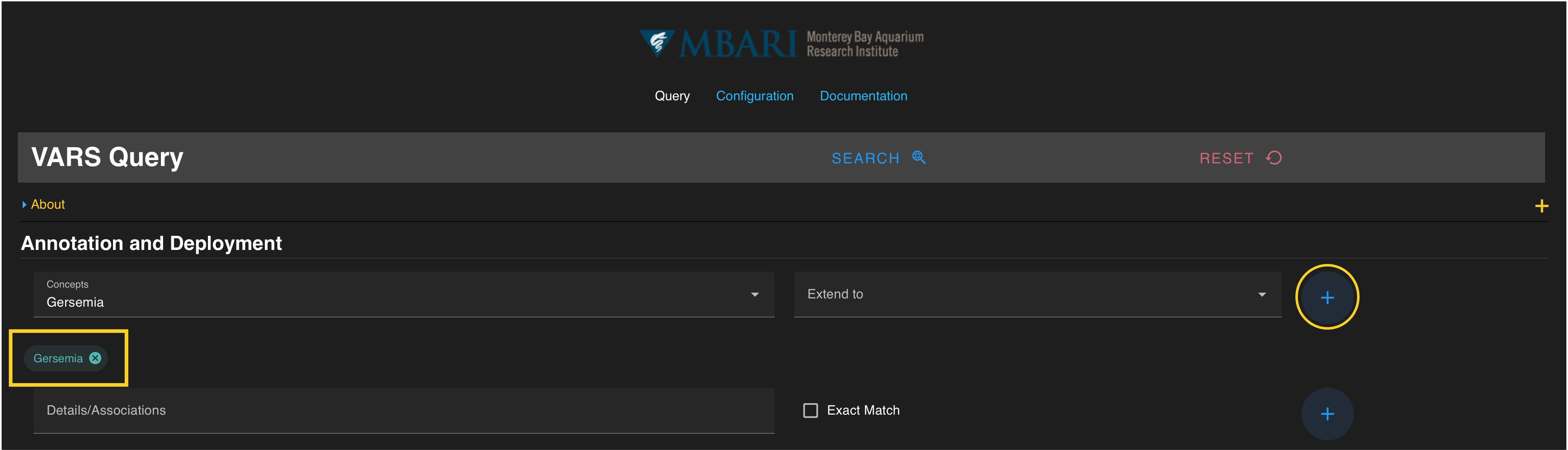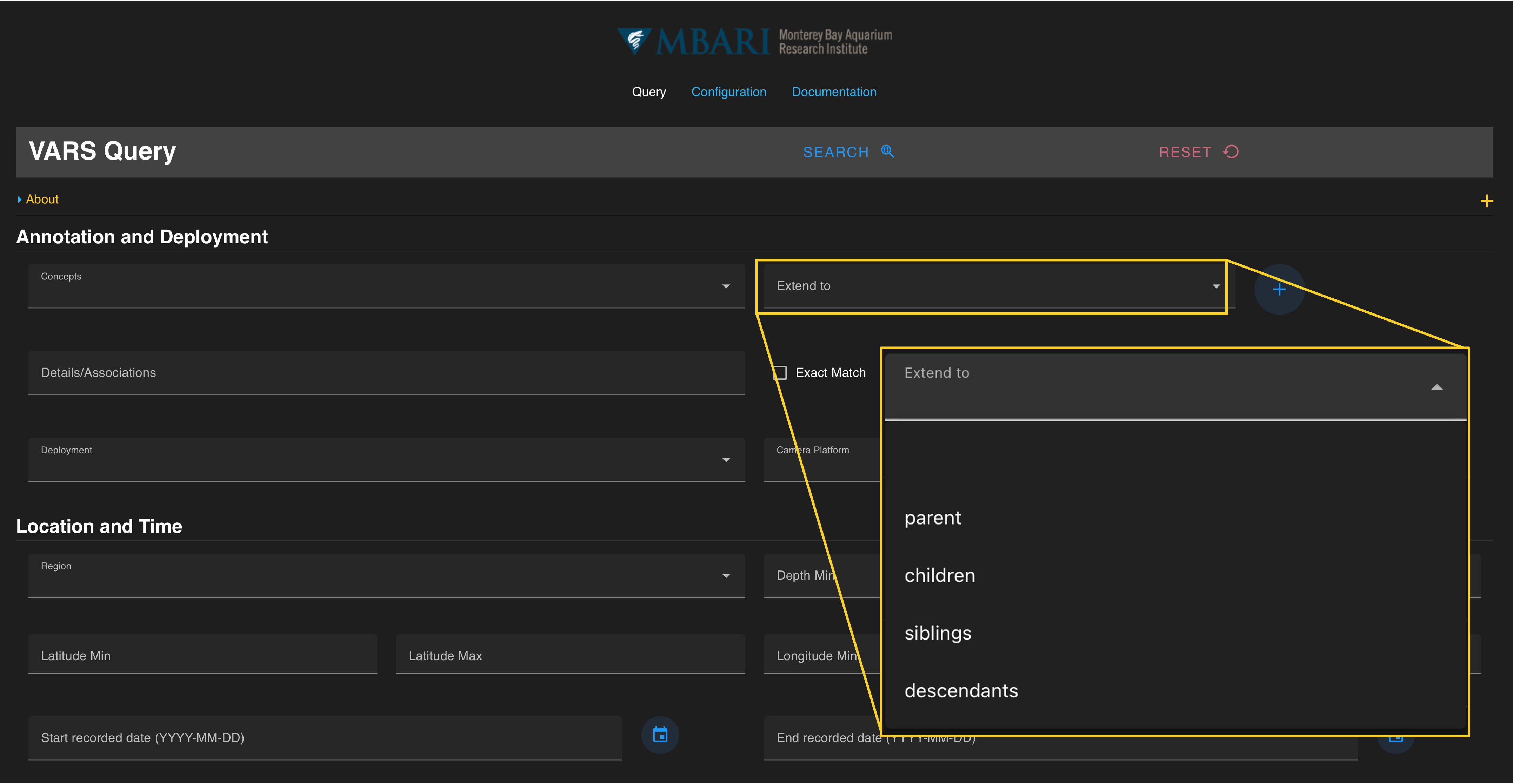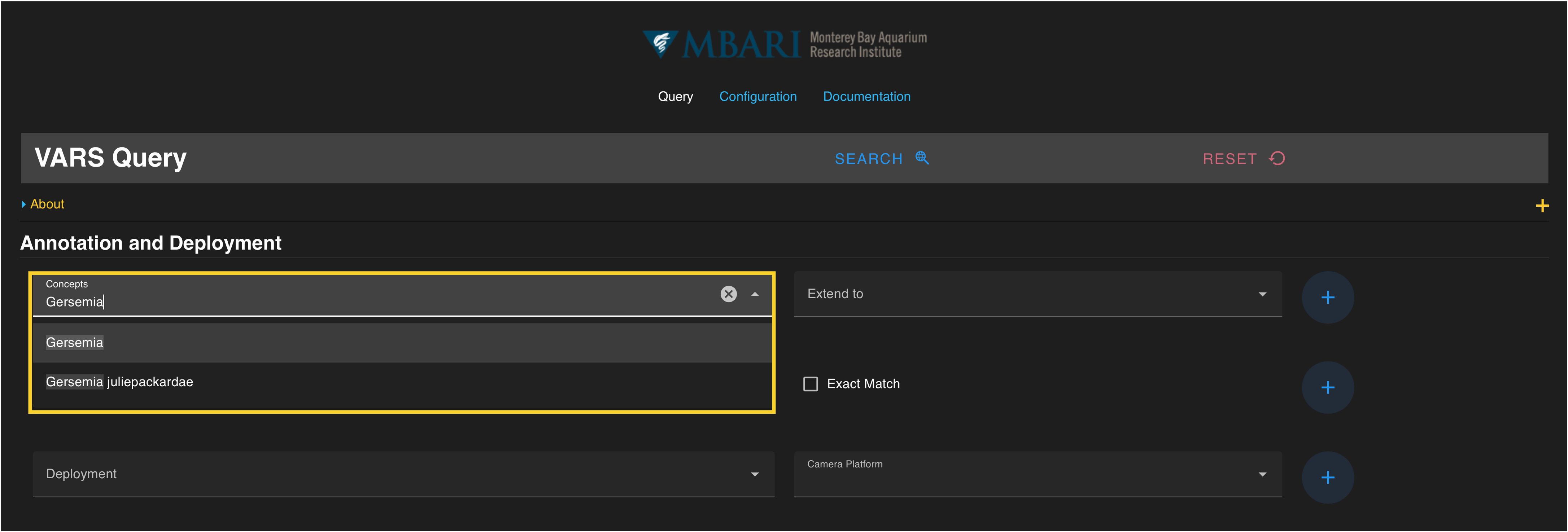 Concepts are selected from a database of all formal and common taxonomic, geologic, and technical names. Begin typing a name in the Concepts search box under the Annotation and Deployment section of the query. The selection options update as you type. A full list of concepts is located in Appendix A. Alternatively, you can scroll through a drop-down list of available concepts in alphabetical order. Click on a name to select it.