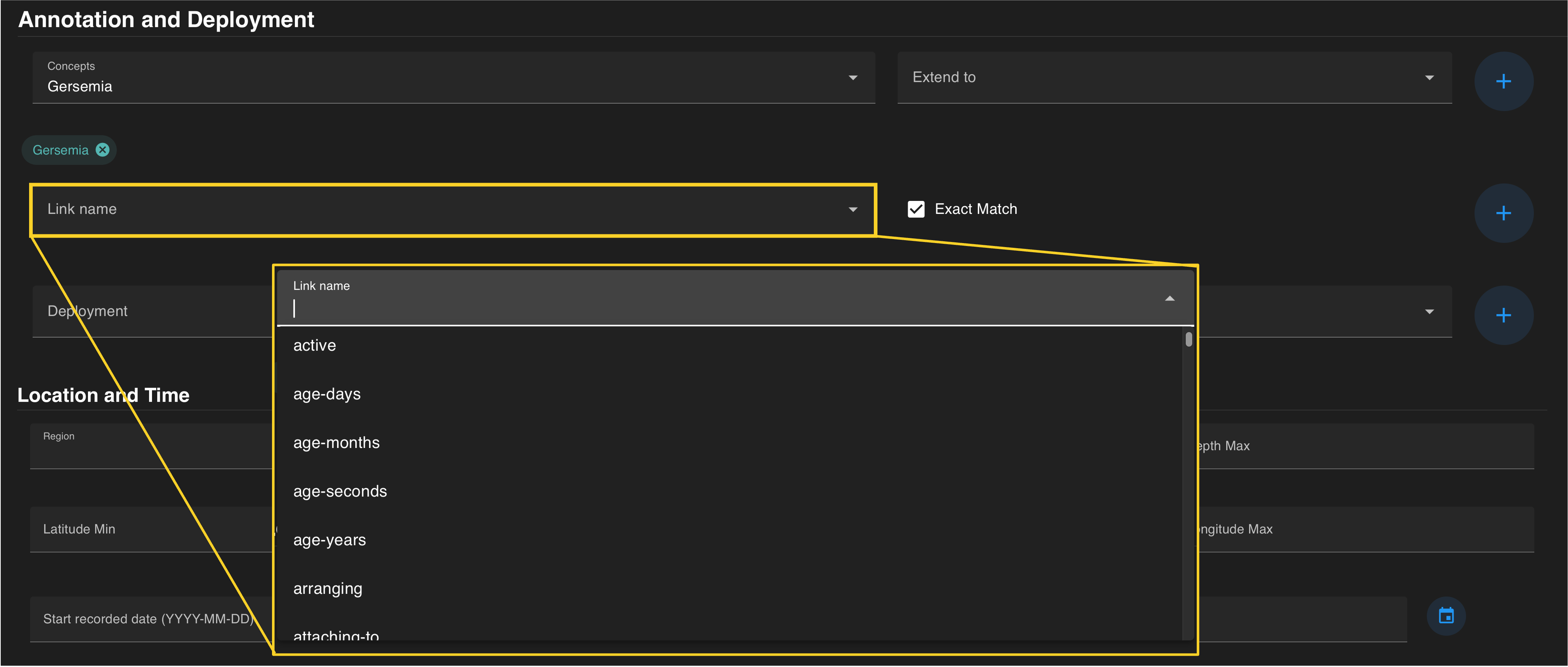 Exact Match constrains the search by specific associations from the knowledgebase. Once the Exact Match box is selected, an alphabetical list becomes available with Link Name values from the database. A full list of associations can be found in Appendix B.