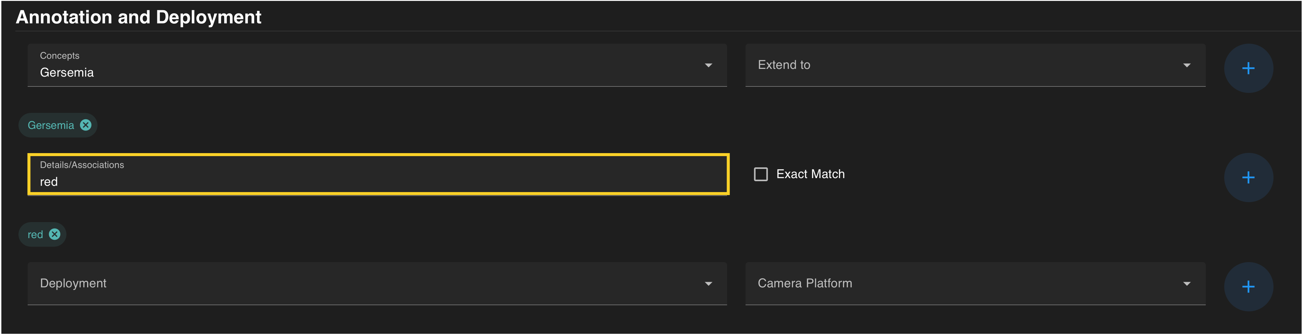 Once a detail or link value is entered, add the term to the current query by pressing the blue on the right. The term should be visible in a colored search chip below the search box. Details can be removed from a search by clicking the located on each chip.