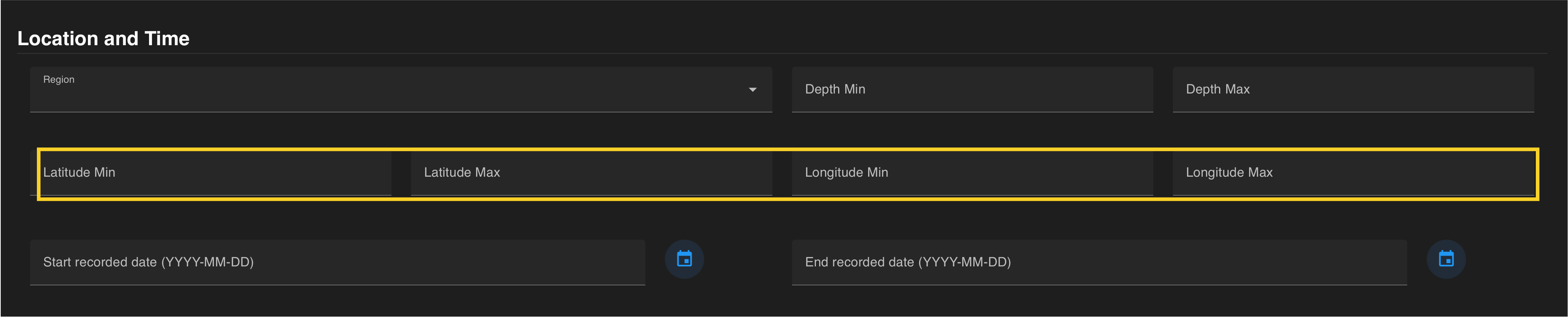 Coordinates (latitude and longitude) can be manually to define a custom search area. Minimum and maximum coordinates should be entered in decimal degrees. For a single point, enter the same value for the minimum and maximum values for each latitude and longitude.
