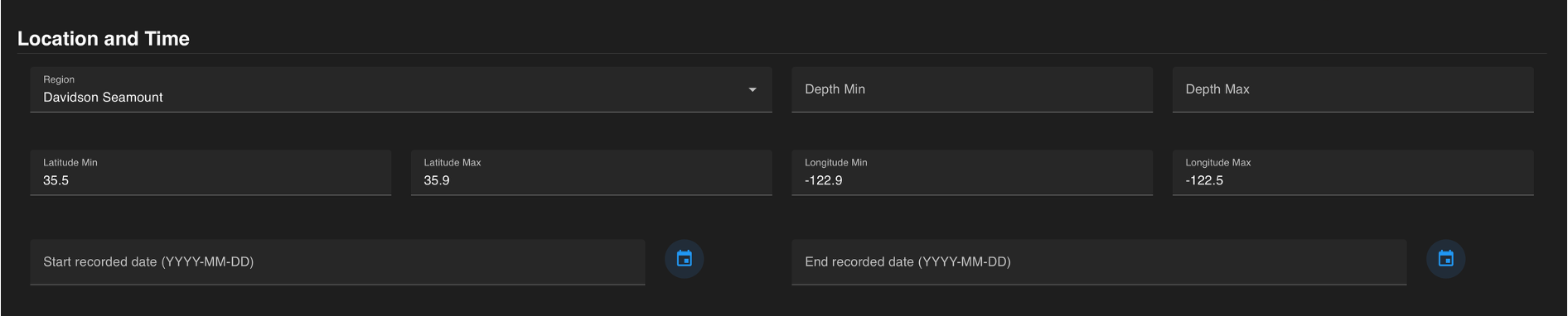 Regions allow users to select from a list of predefined regions commonly used in MBARI research. These preset options allow you to quickly focus your query on well-known areas of study without needing to enter coordinates manually. When a region is selected, the corresponding coordinates populate in the latitude and longitude fields.