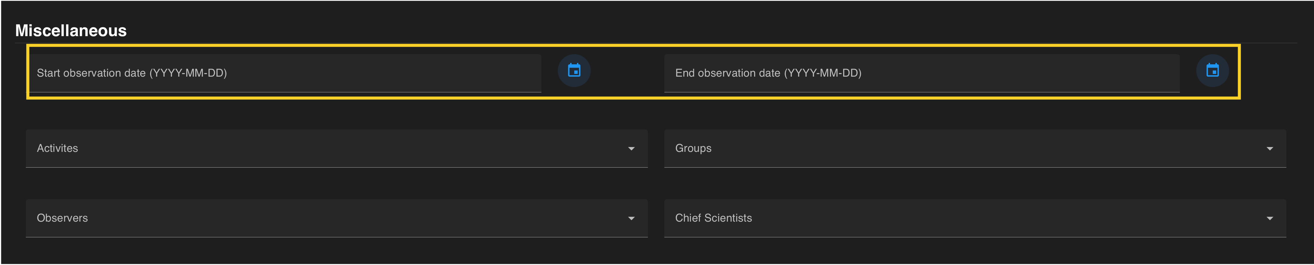 Observation dates can also be selected using the calendar function on the right side of the entry field. Dates can be entered as a range or a singular date. To constrain to one day, choose the same date for the start and the end of the date range.