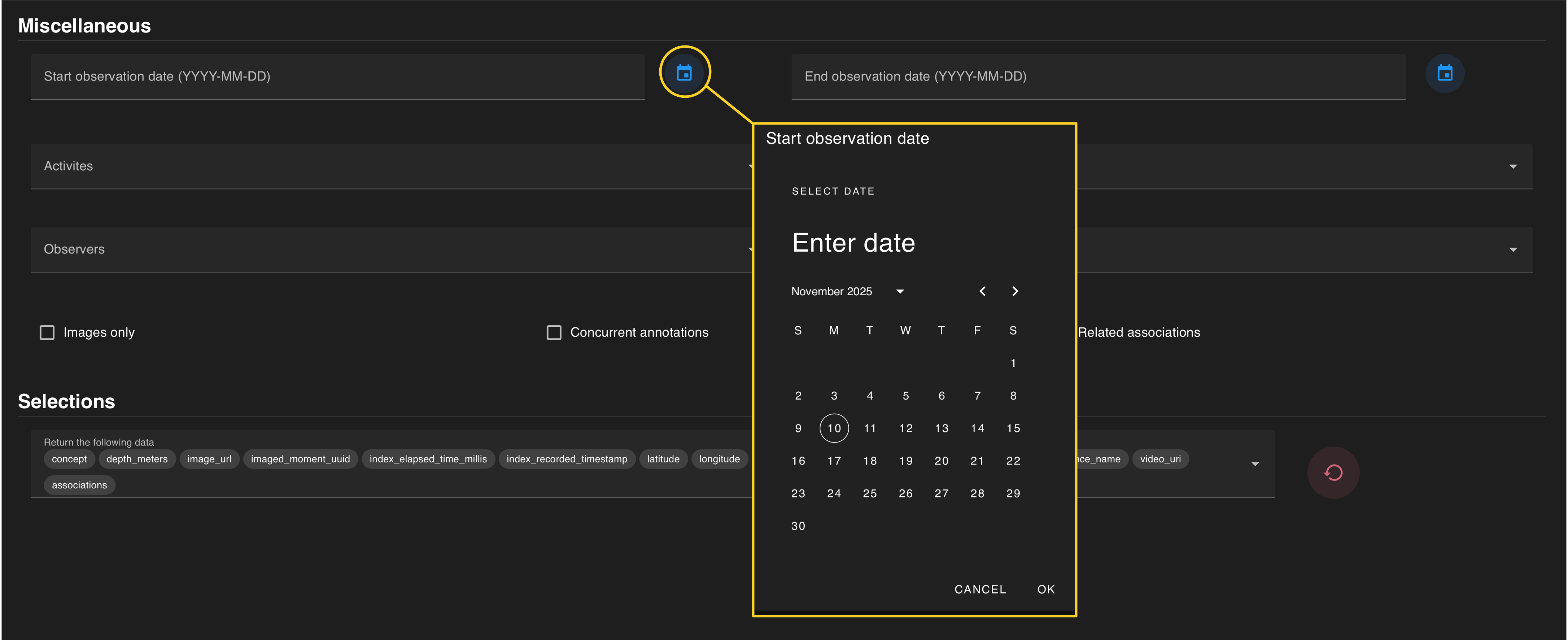 A query can be constrained by the date for an observation. An observation date is the date the annotation itself was made. This is different from the recorded date. Dates and times are in UTC.