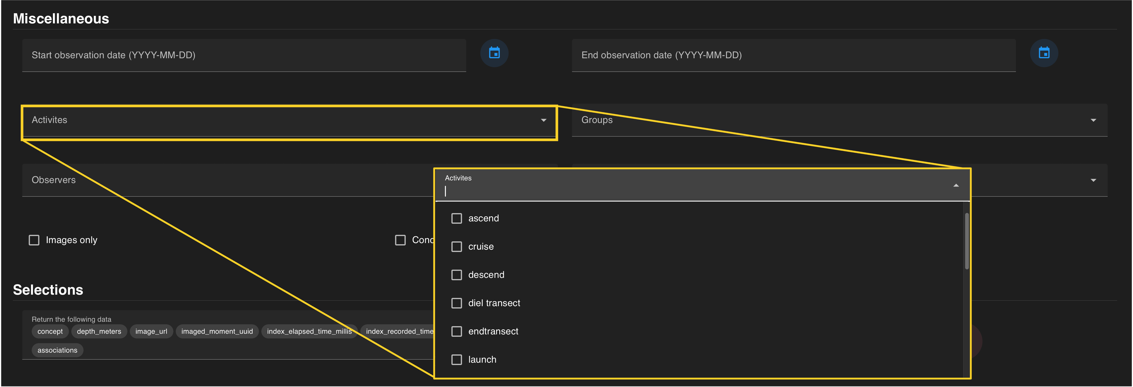 An activity includes the direction or movement of the camera or the intended activity associated with a particular annotation. You can constrain your search by one or more activities selected from the drop-down menu.