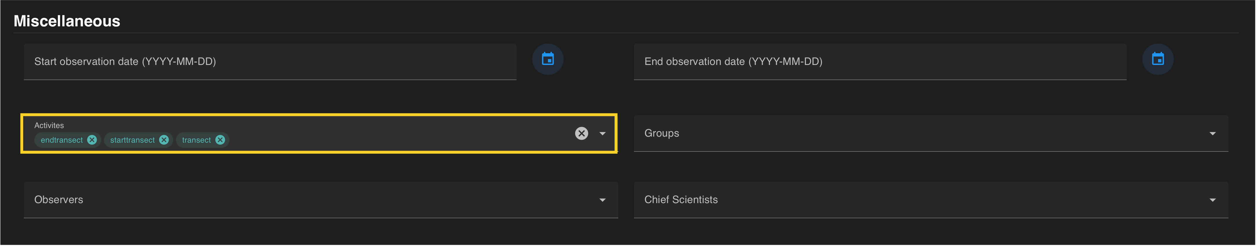 Activities are automatically added to the query once selected within the drop down menu. Each activity should be visible in a colored search chip within the activities search field. Individual activities can be removed from a search by clicking the located on each chip. The entire field can be reset by clicking the white :oticons-x-circle: on the right that becomes visible when hovering over the field.