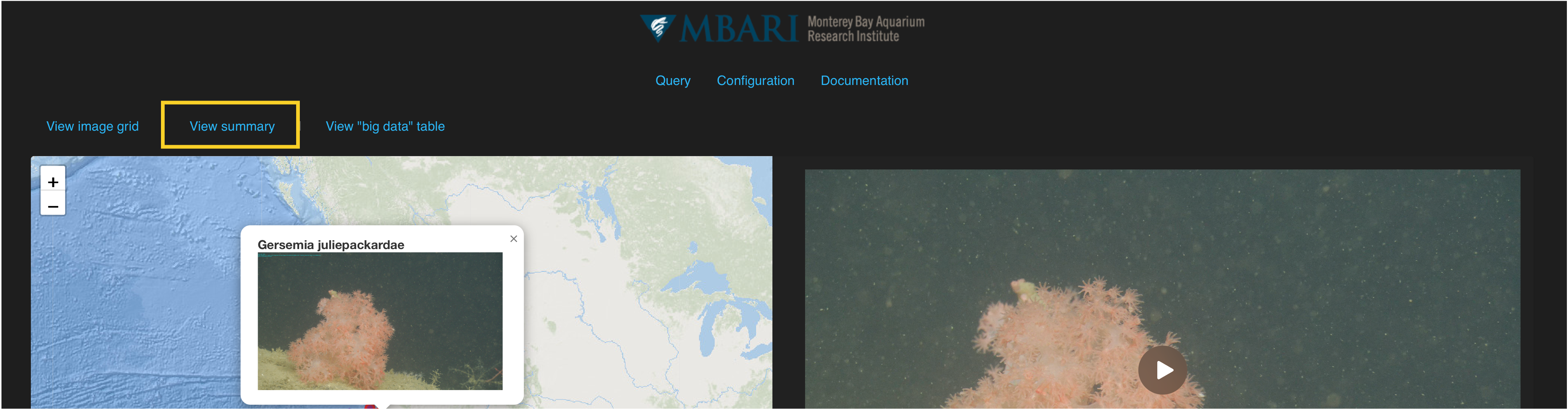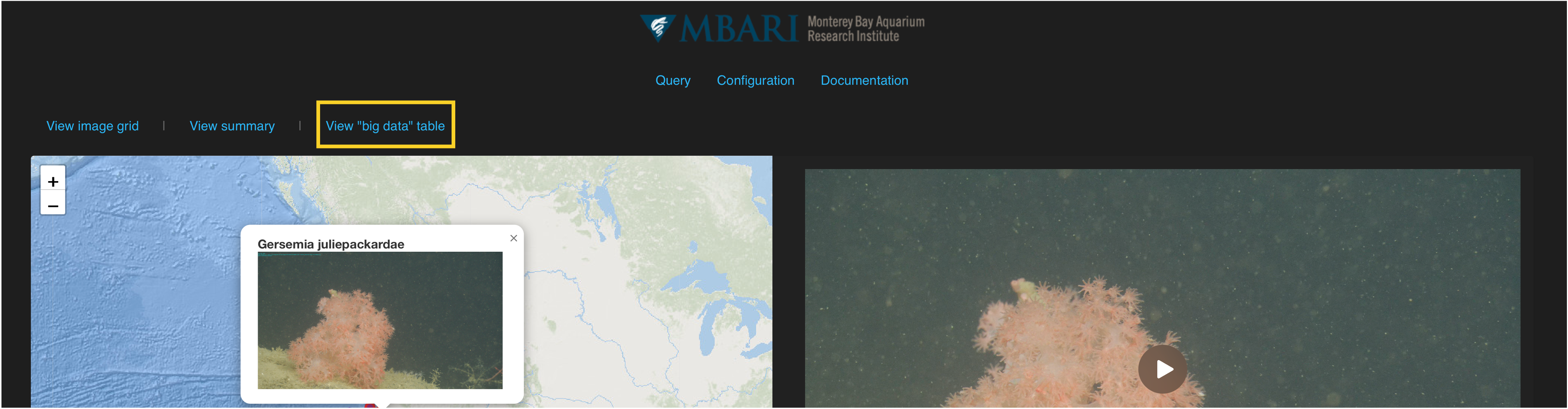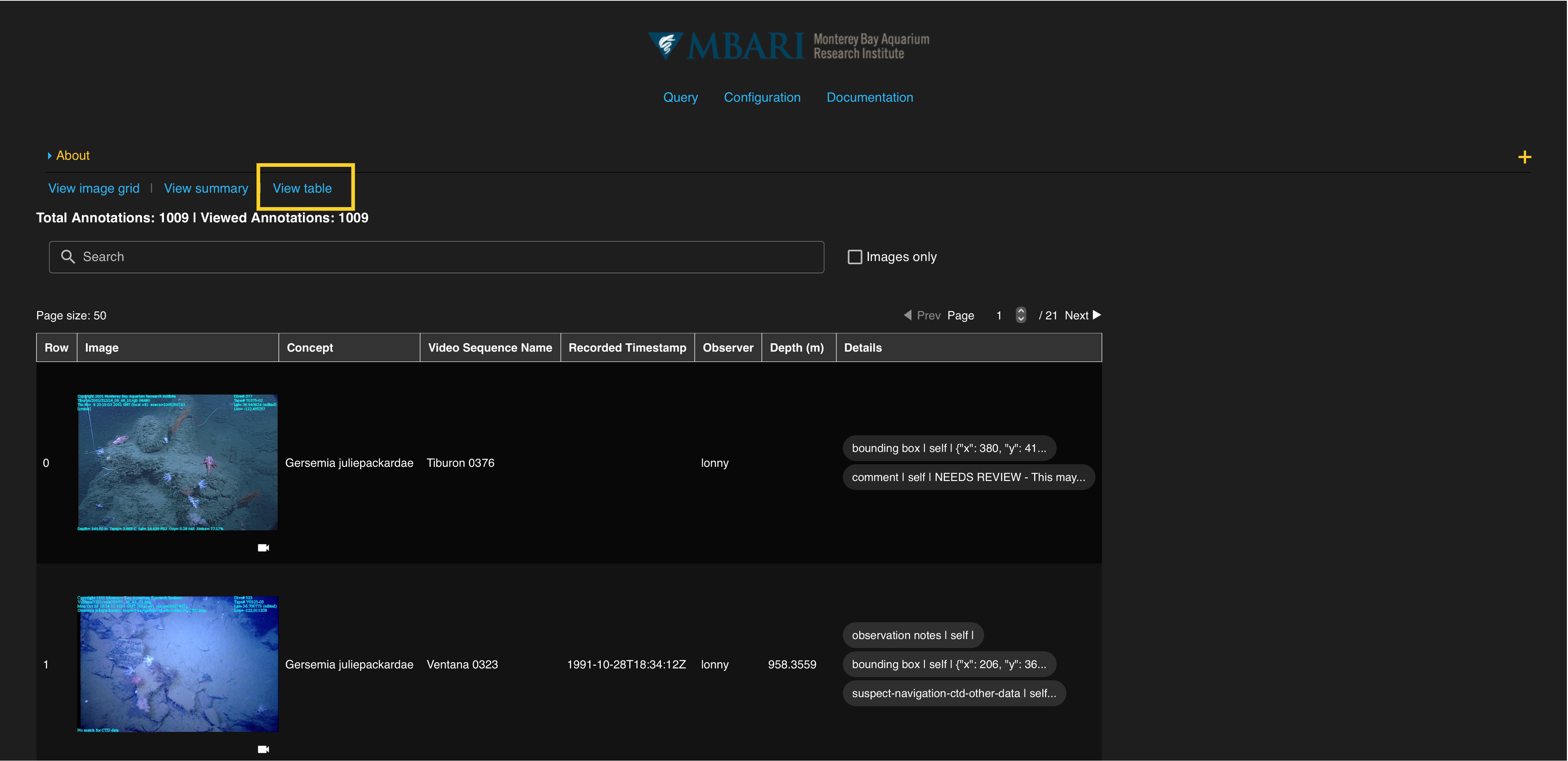 The "big data" table view of the query results shows a stripped down version of the query results. Parameters include and image (when applicable), the concept name, recorded timestamp, observer, depth, and details.