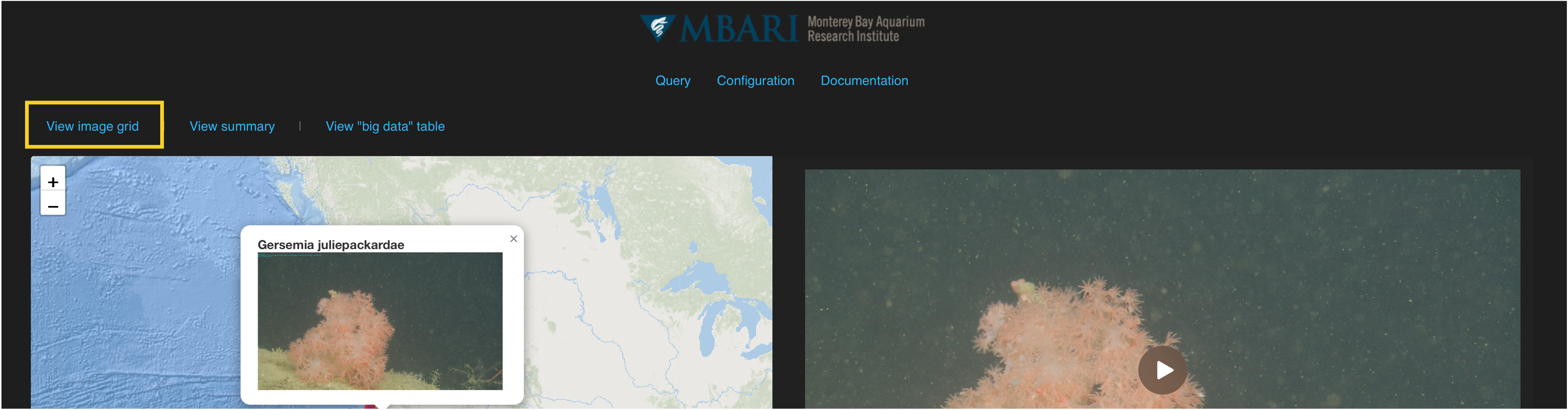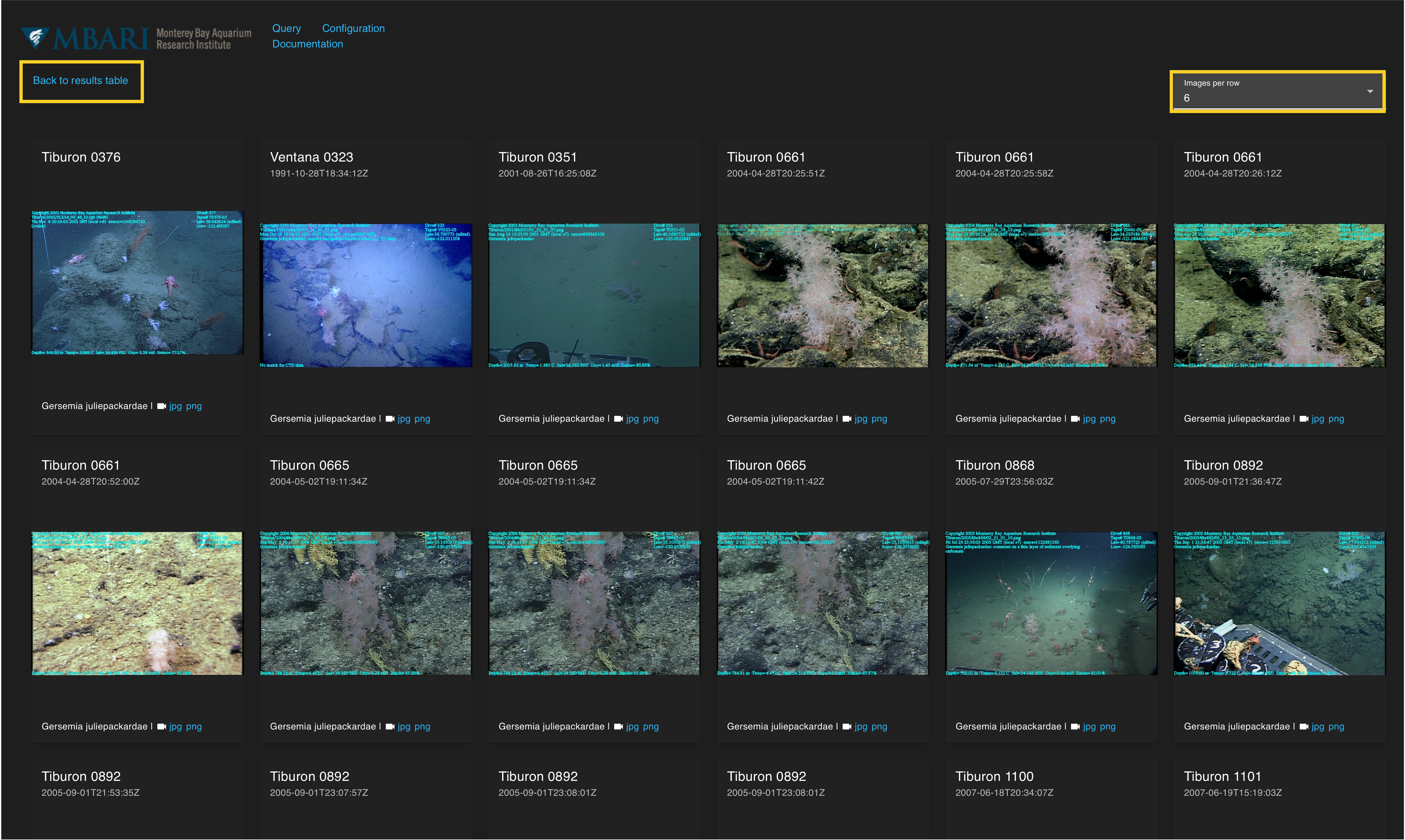 The image grid can be adjusted to show 1 to 6 images per row. Each image will enlarge when you click on it. There are also options to enlarge the jpg or png under each image grid. Click on the image again to go back to the image grid. The video can be accessed by clicking the video camera icon (). This opens in a new window so be sure to check your pop-up settings in your browser if it does not appear. Click Back to the results table to view your query results table.